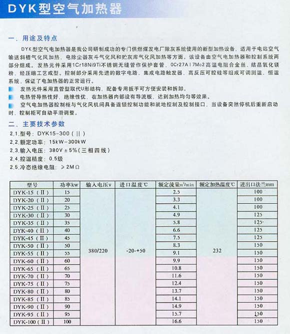 DYK型空氣點加熱器是我公司研制成功的專門供燃煤發電廠除灰系統使用的新型加熱設備,適用于電站空氣輸送料槽氣化風加熱。電除塵灰斗氣化風和貯灰庫氣化風加熱方面。該設備由空氣電加熱器和控制系統兩部分組成。發熱元件采用1Cr18Ni9Ti不銹鋼無縫管作保護套管。0Cr27A17Mo2高溫電阻合金絲,結晶氧化鎂粉,經壓縮工藝成型,控制部分采用先進的數字電路,集成電路觸發器,高反壓可控硅等組成可調測溫,恒溫系統,保證了電加熱器的正常運行。