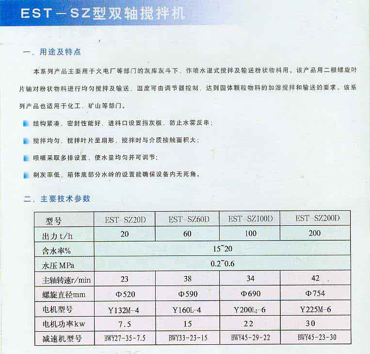 本系列產品主要用于火電廠等部門的灰庫灰斗下,作噴水濕式攪拌以及輸送粉狀物料用。該產品用二根螺旋葉片對粉狀物料進行均勻攪拌及輸送,溫度可由調節器控制,達到固體顆粒物料的加濕攪拌和輸送要求。該系列產品也適用于化工,礦山等部門。