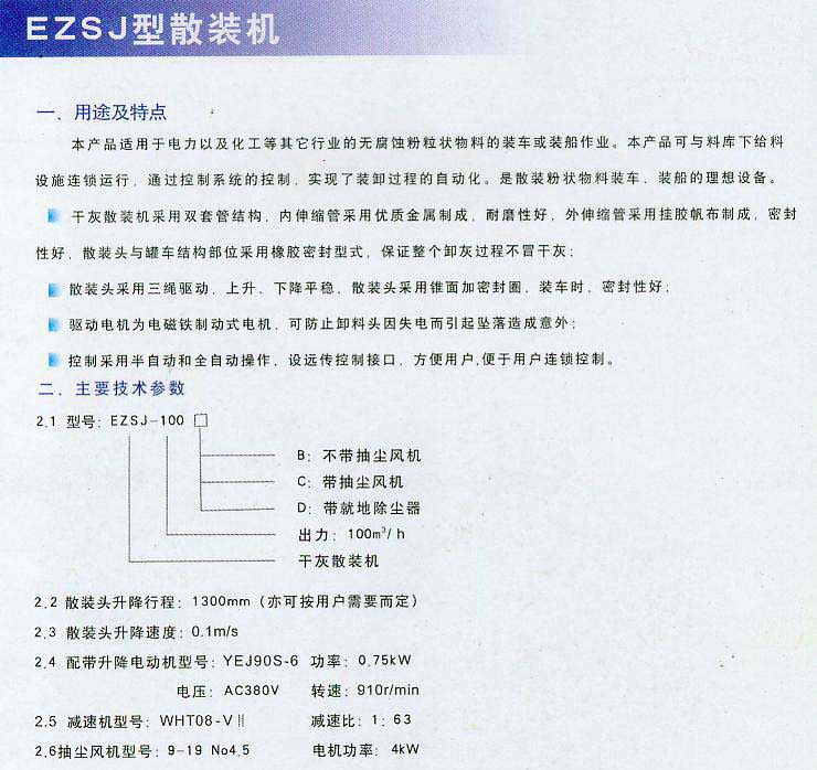 本產品使用于電力以及化工等其他行業的無腐蝕粉狀物料的撞車和裝船作業。本產品可與料庫下給料設施連鎖運行,通過控制系統的控制,實現了裝卸過程的自動化,是散裝粉狀物物料裝車,裝船的理想設備。